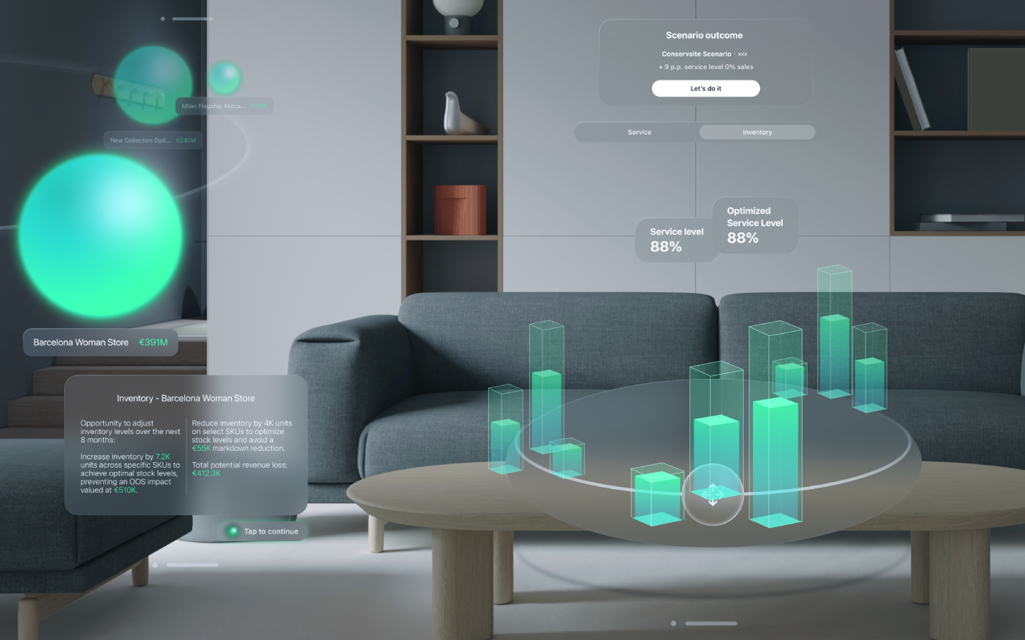 Complex AI insights could be explored in spatial layouts, helping users understand relationships and trends that are difficult to perceive in flat interfaces.